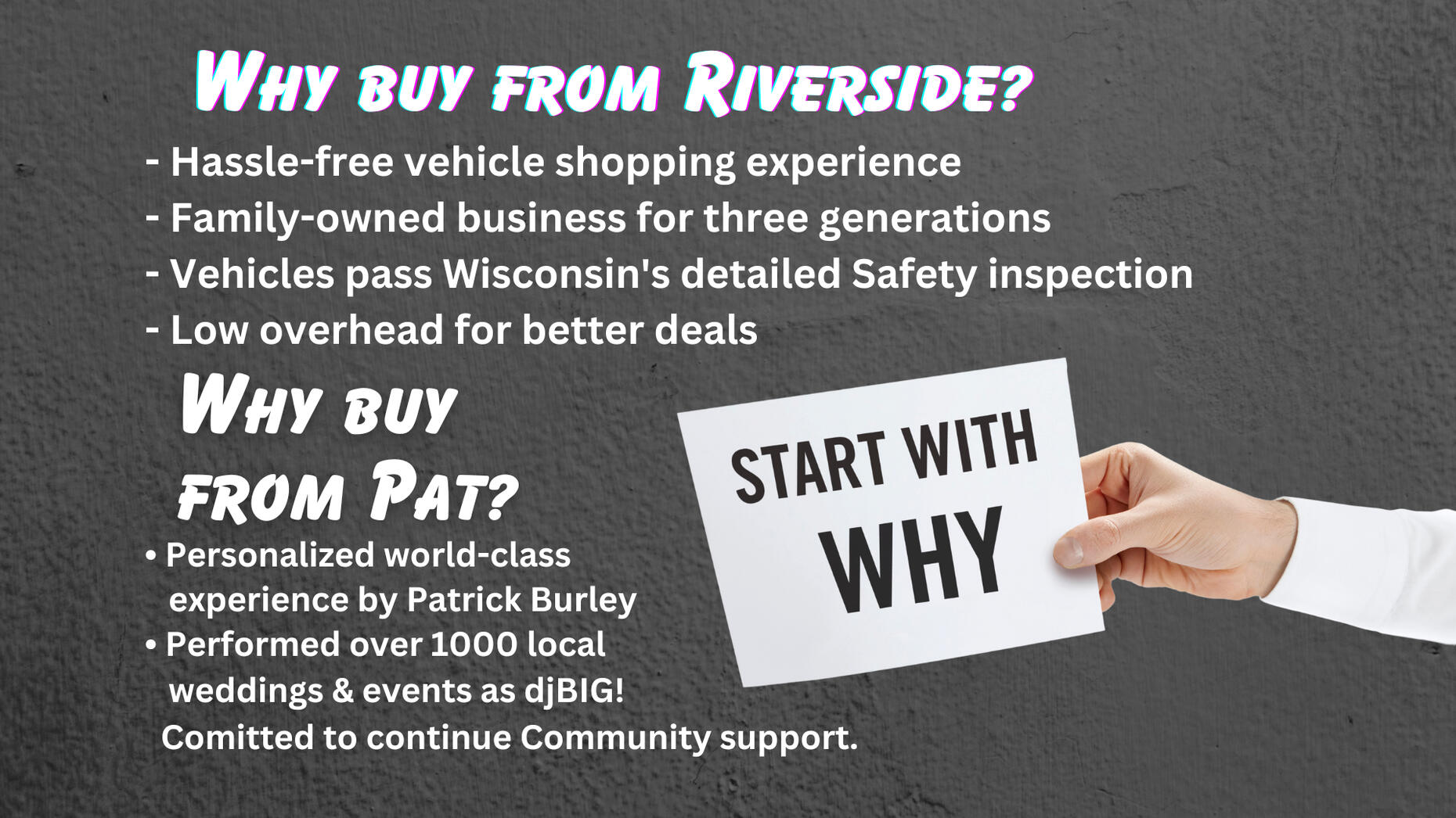 Subject: Join Me in Making a DifferenceDear Friends,I hope this message finds you well. My name is Patrick Burley, and I’m a 33yr, experienced DJ/MC who believes in the power of community support. Over the years, I’ve dedicated my efforts to fundraisers like "Cans for Greg" and various cancer benefits, and it has truly been a rewarding journey.Today, I’m reaching out to you with an open heart and a hopeful spirit. My mission is to expand my support for those in need, and I need your help to make this happen. Whether you're looking for a vehicle or simply want to refer someone who is, I’m here for you. At Riverside Marinette, I’m committed to not just selling vehicles but also driving change in our community.If you or someone you know is considering a vehicle purchase, I kindly ask you to “Ask for Pat.” Your referrals can make a world of difference, allowing me to continue my work in supporting those who are facing challenges. Together, we can create a ripple effect of kindness and compassion.Thank you from the bottom of my heart for your support, whether it’s for yourself, your family, or your neighbors. Let’s come together to uplift our community and make a lasting impact.Warm regards,Patrick Burley